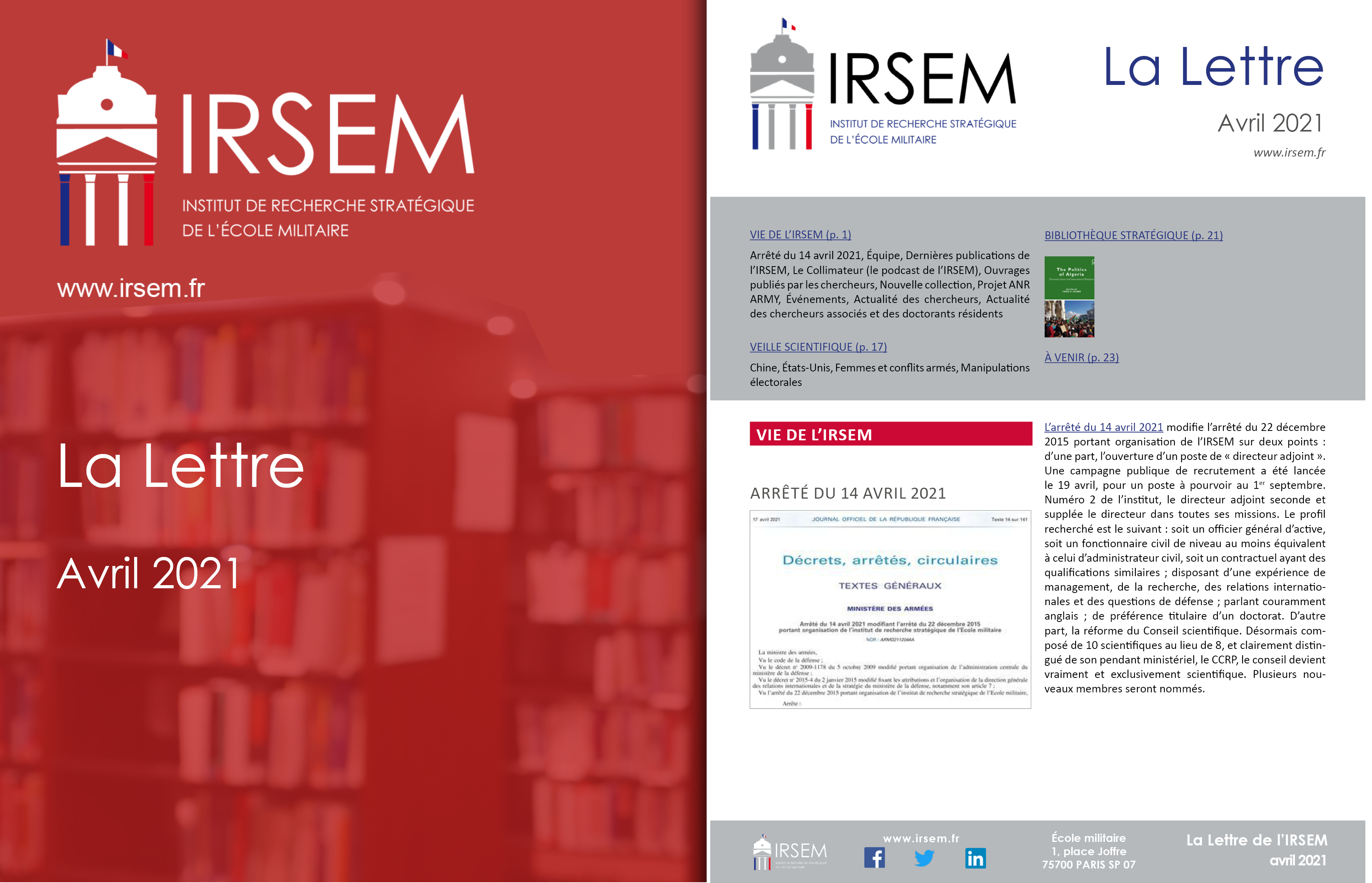 Arrêté du 14 avril 2021, Équipe, Dernières publications de l’IRSEM, Le Collimateur (le podcast de l’IRSEM), Ouvrages publiés par les chercheurs, Nouvelle collection, Projet ANR ARMY, Événements, Actualité des chercheurs, Actualité des chercheurs associés et des doctorants résidents.