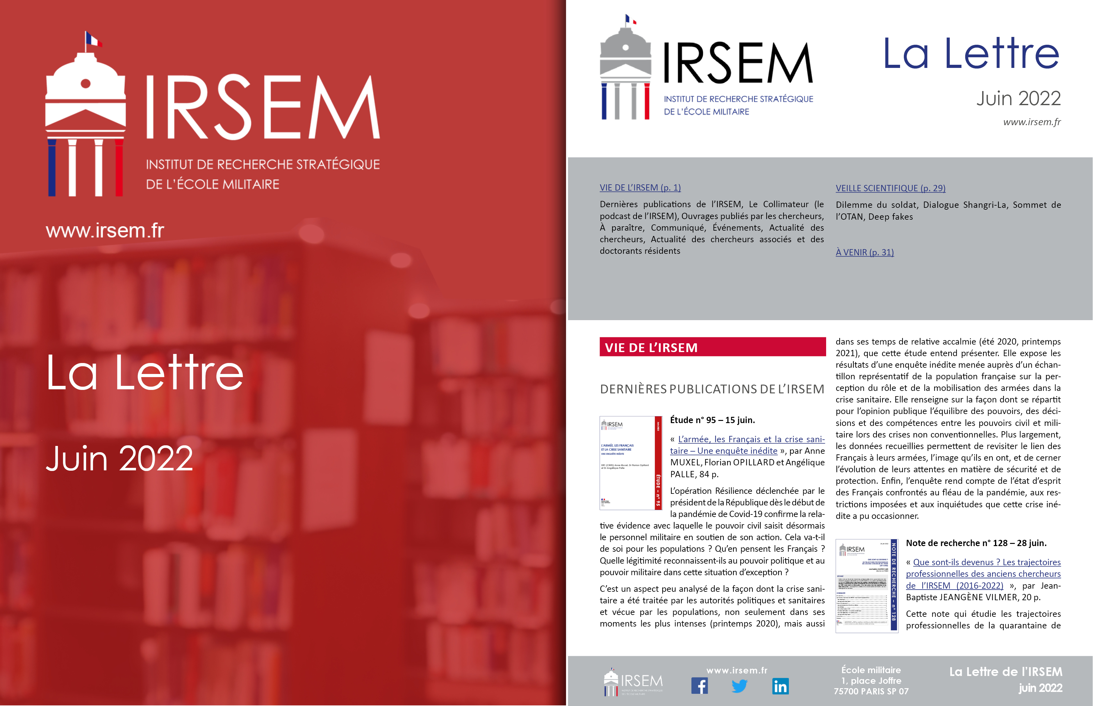 La Lettre de l'IRSEM est notre lettre d'information. Chaque mois, chercheurs résidents et invités y présentent des chroniques et points d'actualité. Vous trouverez dans cette rubrique les liens vers les numéros de chaque collection annuelle.