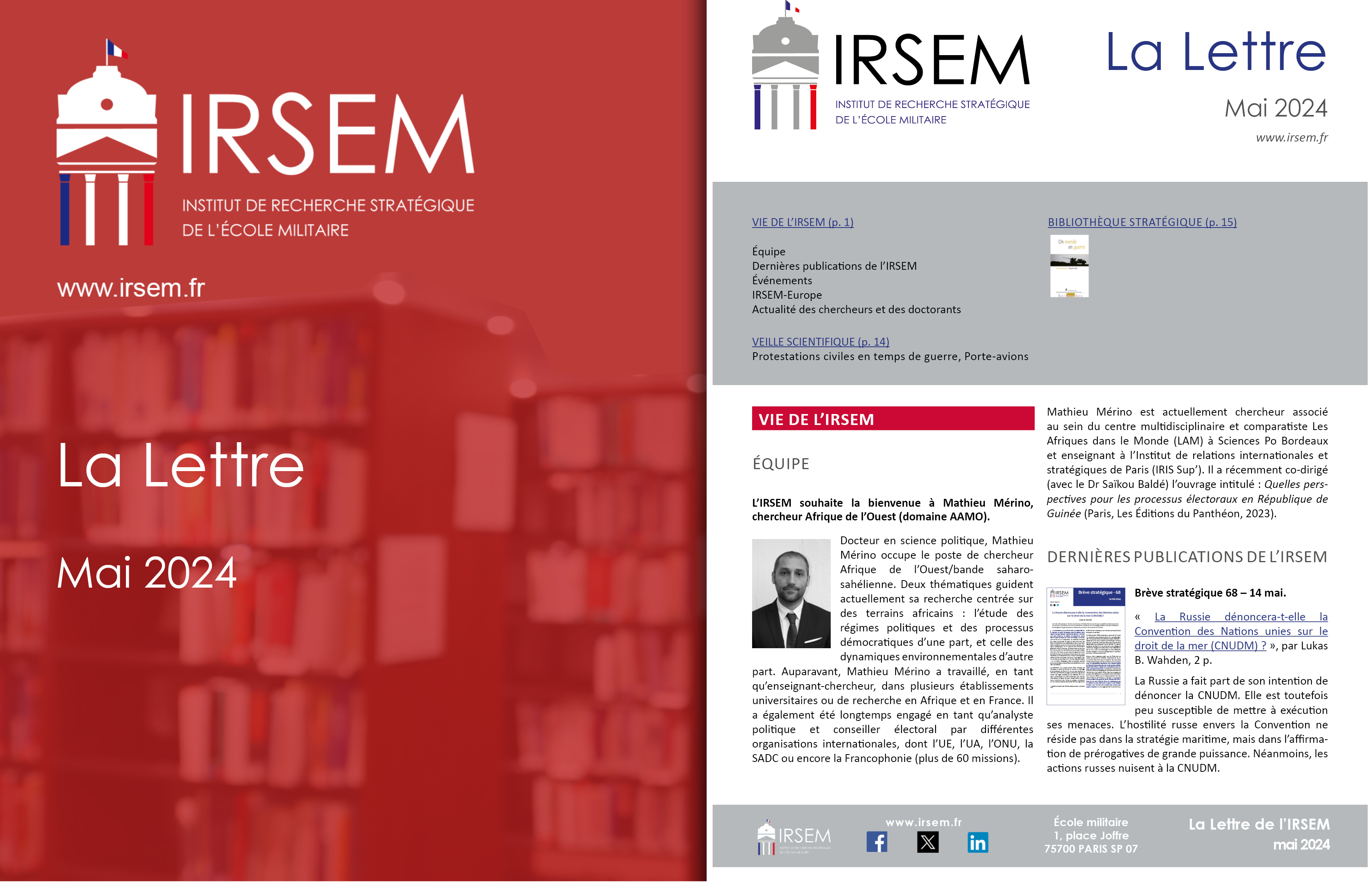 La Lettre de l'IRSEM est notre lettre d'information. Chaque mois, chercheurs résidents et invités y présentent des chroniques et points d'actualité. Vous trouverez dans cette rubrique les liens vers les numéros de chaque collection annuelle.