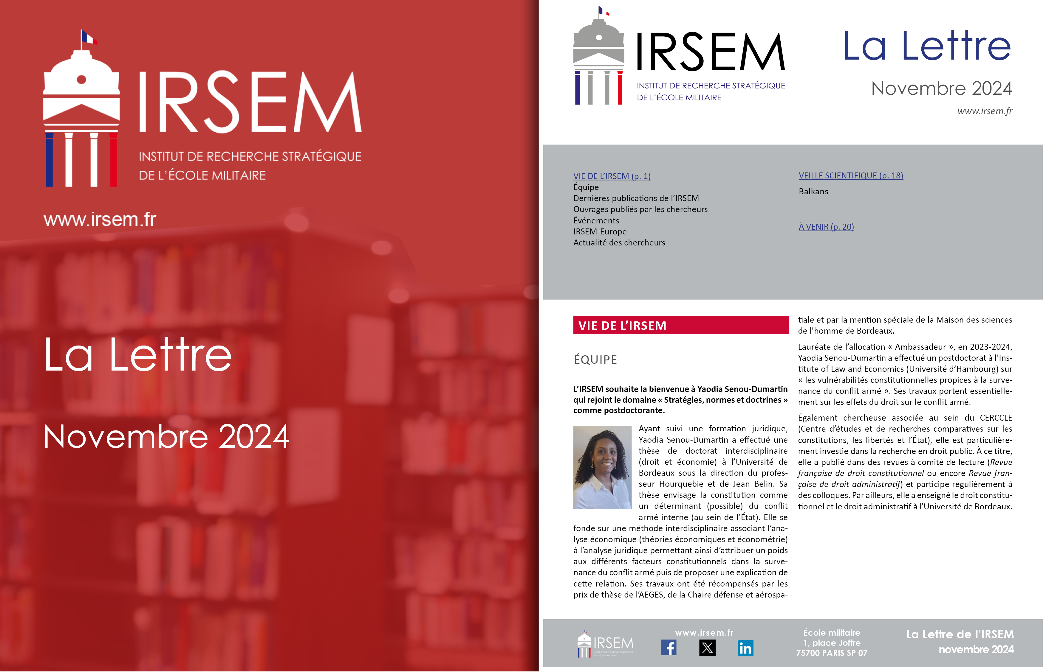 La Lettre de l'IRSEM est notre lettre d'information. Chaque mois, chercheurs résidents et invités y présentent des chroniques et points d'actualité. Vous trouverez dans cette rubrique les liens vers les numéros de chaque collection annuelle.