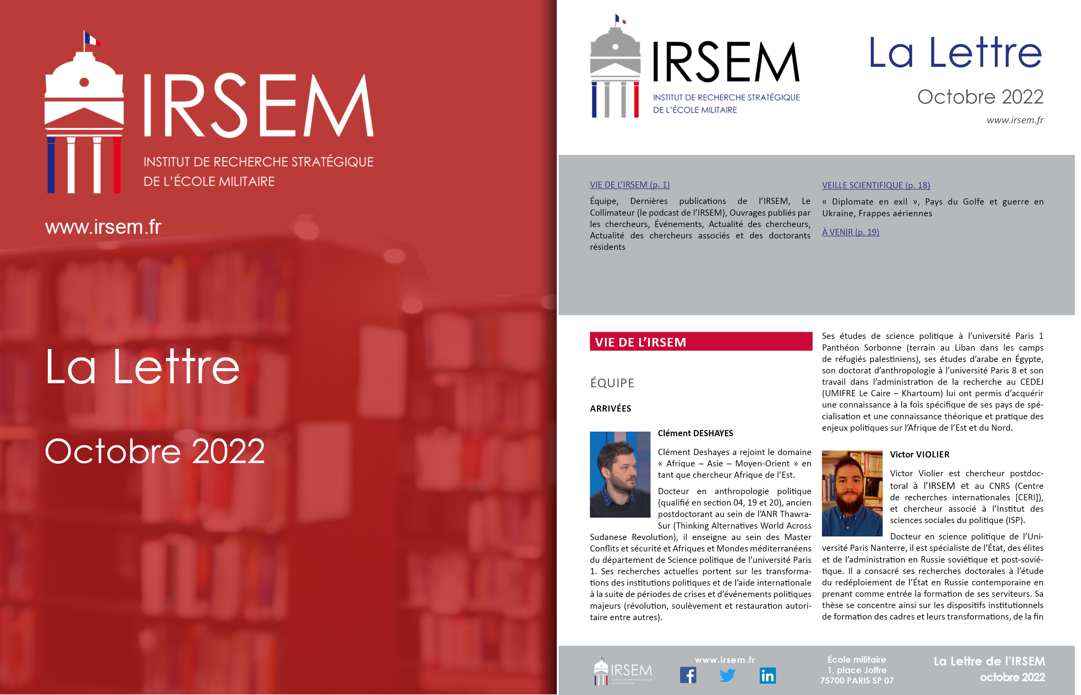 La Lettre de l'IRSEM est notre lettre d'information. Chaque mois, chercheurs résidents et invités y présentent des chroniques et points d'actualité. Vous trouverez dans cette rubrique les liens vers les numéros de chaque collection annuelle.