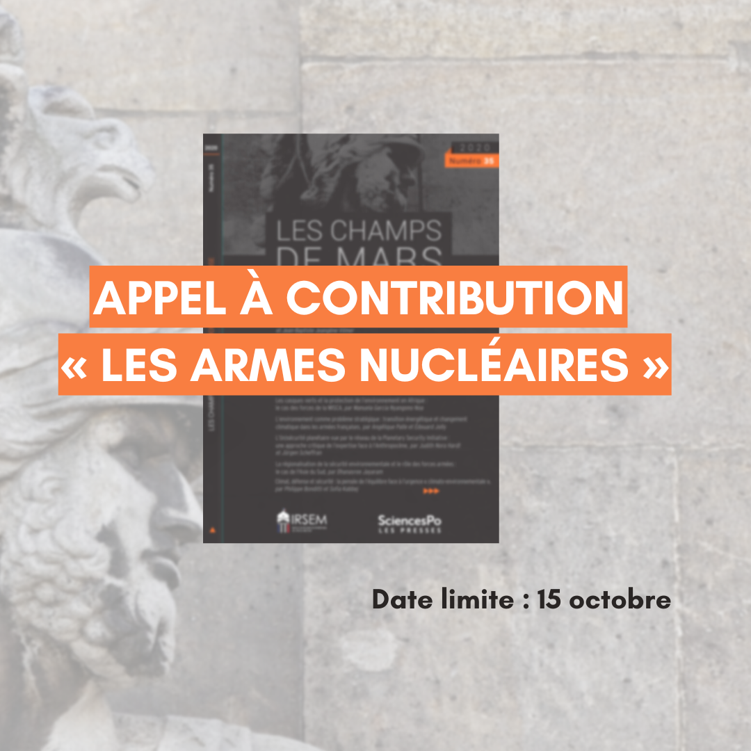 La revue Les Champs de Mars (IRSEM/Presses de Sciences Po), en collaboration avec le groupe « Politique internationale et armes nucléaires » de l’Association pour les études sur la guerre et la stratégie, consacre en 2023 un numéro spécial à la thématique des armes nucléaires, destiné à offrir aux lecteurs un point de situation sur la relation entre les armes nucléaires et la sécurité internationale ainsi qu’un état des lieux de la recherche sur ces questions. Ainsi, les chercheurs confirmés mais aussi les jeunes chercheurs sont invités à proposer une contribution quelle que soit leur discipline. L’objectif des responsables scientifiques est de favoriser la diversité des approches sur un sujet souvent considéré comme l’apanage des études stratégiques.