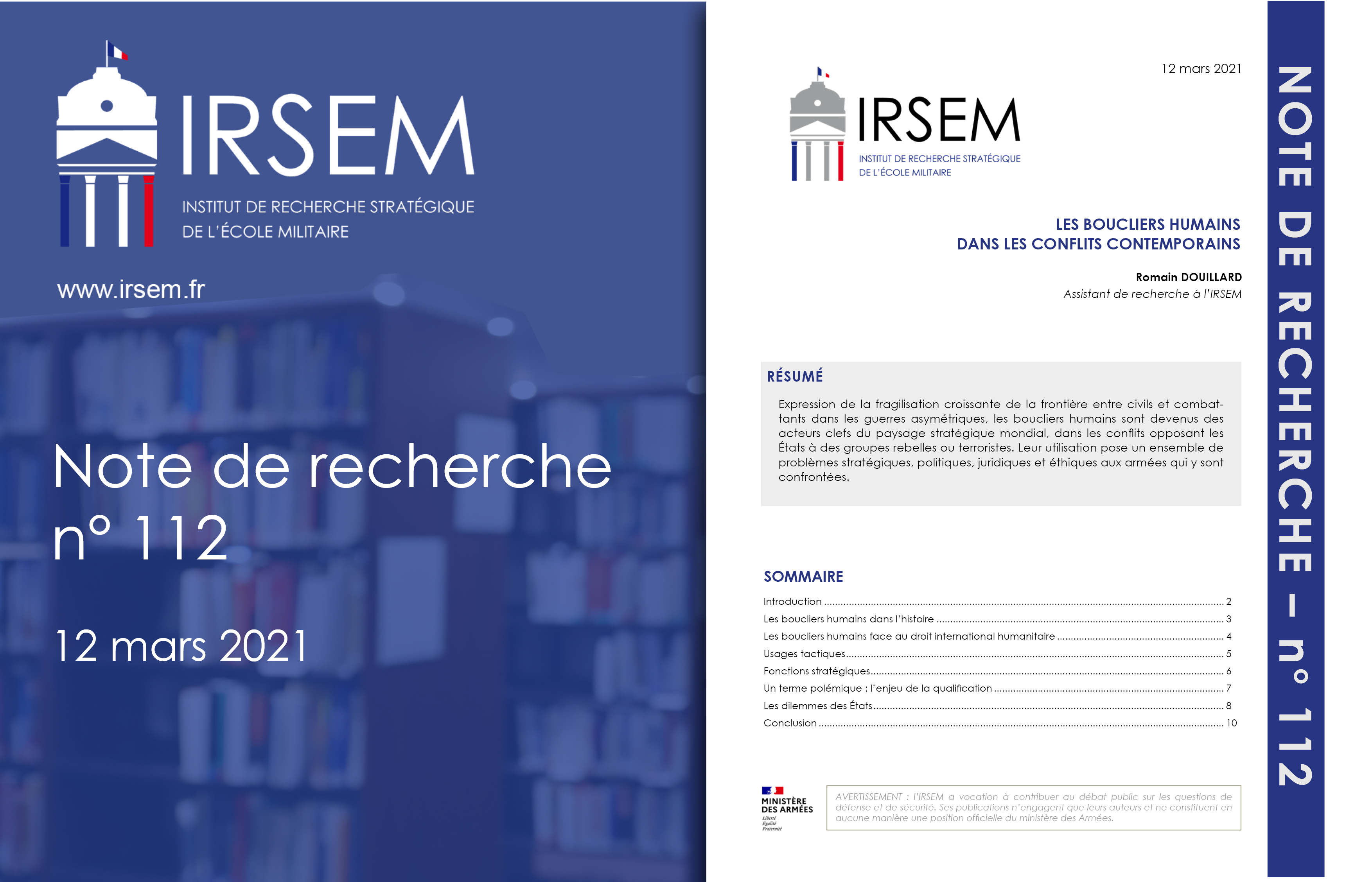 Expression de la fragilisation croissante de la frontière entre civils et combattants dans les guerres asymétriques, les boucliers humains sont devenus des acteurs clefs du paysage stratégique mondial, dans les conflits opposant les États à des groupes rebelles ou terroristes. Leur utilisation pose un ensemble de problèmes stratégiques, politiques, juridiques et éthiques aux armées qui y sont confrontées.