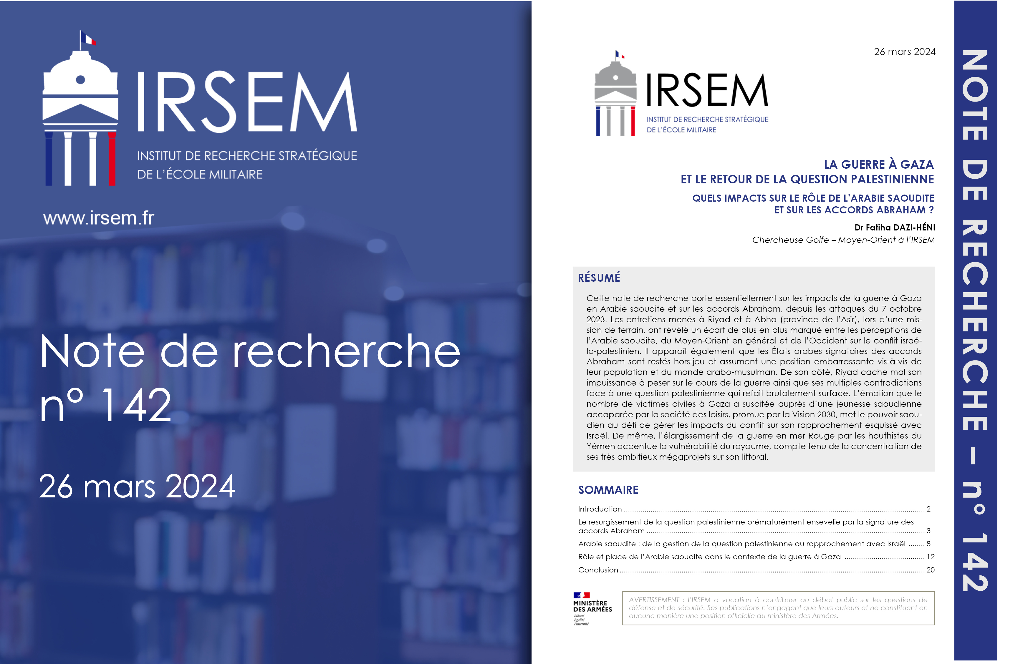 Cette note de recherche porte essentiellement sur les impacts de la guerre à Gaza en Arabie saoudite et sur les accords Abraham, depuis les attaques du 7 octobre 2023. Les entretiens menés à Riyad et à Abha (province de l’Asir), lors d’une mission de terrain, ont révélé un écart de plus en plus marqué entre les perceptions de l’Arabie saoudite, du Moyen-Orient en général et de l’Occident sur le conflit israélo-palestinien. Il apparaît également que les États arabes signataires des accords Abraham sont restés hors-jeu et assument une position embarrassante vis-à-vis de leur population et du monde arabo-musulman. De son côté, Riyad cache mal son impuissance à peser sur le cours de la guerre ainsi que ses multiples contradictions face à une question palestinienne qui refait brutalement surface. L’émotion que le nombre de victimes civiles à Gaza a suscitée auprès d’une jeunesse saoudienne accaparée par la société des loisirs, promue par la Vision 2030, met le pouvoir saoudien au défi de gérer les impacts du conflit sur son rapprochement esquissé avec Israël. De même, l’élargissement de la guerre en mer Rouge par les houthistes du Yémen accentue la vulnérabilité du royaume, compte tenu de la concentration de ses très ambitieux mégaprojets sur son littoral.