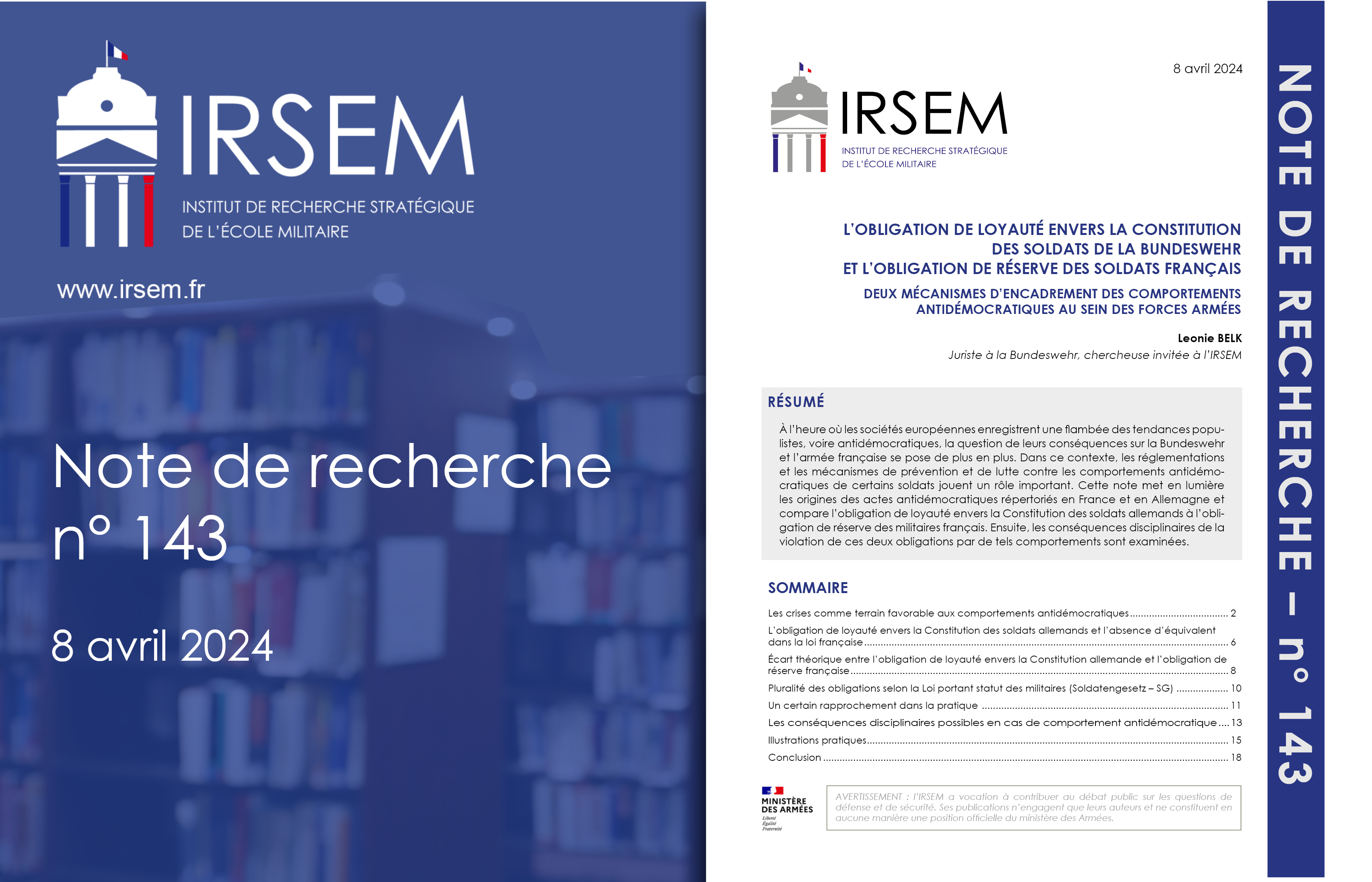À l’heure où les sociétés européennes enregistrent une flambée des tendances populistes, voire antidémocratiques, la question de leurs conséquences sur la Bundeswehr et l’armée française se pose de plus en plus. Dans ce contexte, les réglementations et les mécanismes de prévention et de lutte contre les comportements antidémocratiques de certains soldats jouent un rôle important. Cette note met en lumière les origines des actes antidémocratiques répertoriés en France et en Allemagne et compare l’obligation de loyauté envers la Constitution des soldats allemands à l’obligation de réserve des militaires français. Ensuite, les conséquences disciplinaires de la violation de ces deux obligations par de tels comportements sont examinées.