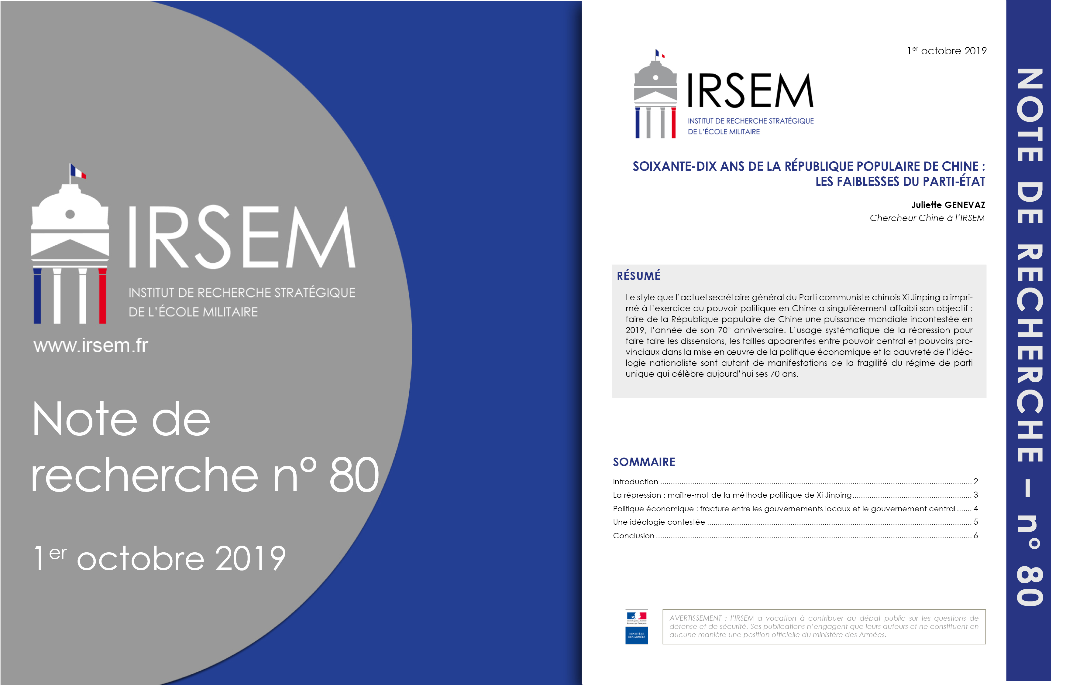 « SOIXANTE-DIX ANS DE LA RÉPUBLIQUE POPULAIRE DE CHINE : LES FAIBLESSES DU PARTI-ÉTAT » de Juliette GENEVAZ, chercheur Chine à l'IRSEM