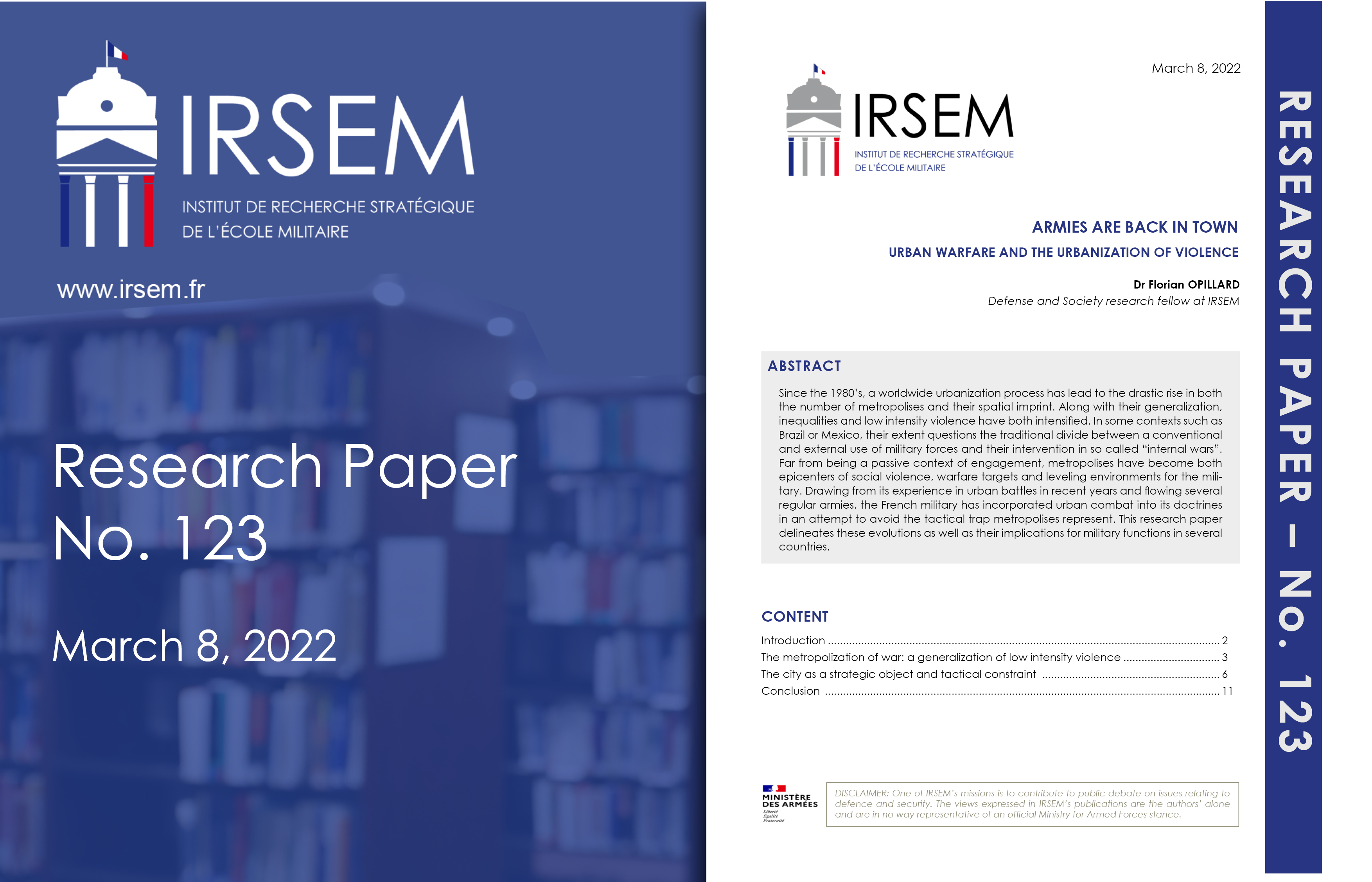 Since the 1980’s, a worldwide urbanization process has lead to the drastic rise in both the number of metropolises and their spatial imprint. Along with their generalization, inequalities and low intensity violence have both intensified. In some contexts such as Brazil or Mexico, their extent questions the traditional divide between a conventional and external use of military forces and their intervention in so called “internal wars”. Far from being a passive context of engagement, metropolises have become both epicenters of social violence, warfare targets and leveling environments for the military. Drawing from its experience in urban battles in recent years and flowing several regular armies, the French military has incorporated urban combat into its doctrines in an attempt to avoid the tactical trap metropolises represent. This research paper delineates these evolutions as well as their implications for military functions in several countries.