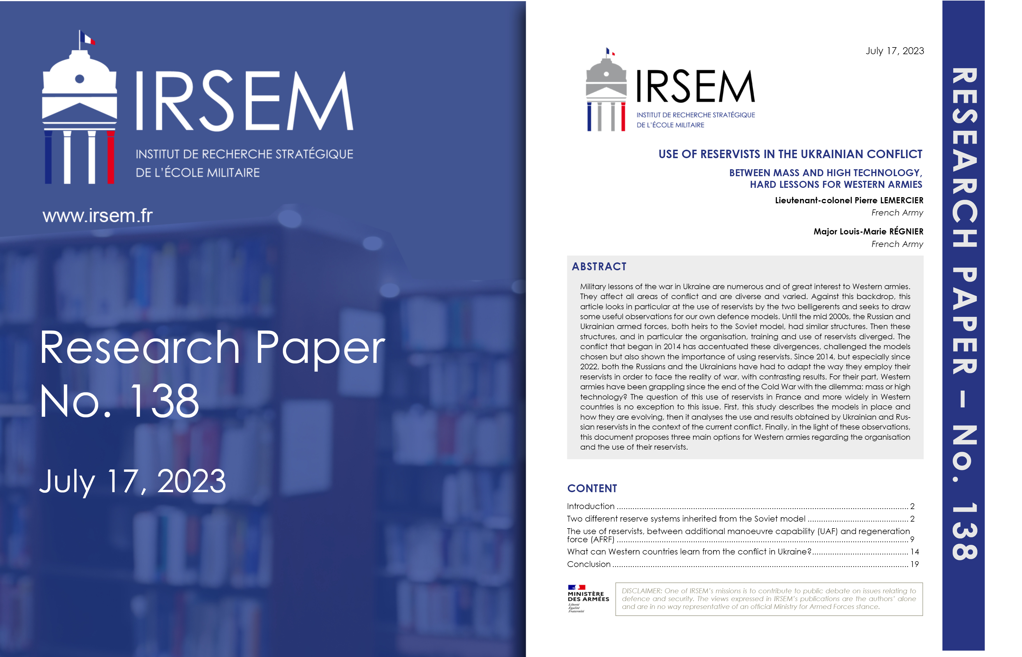 Military lessons of the war in Ukraine are numerous and of great interest to Western armies. They affect all areas of conflict and are diverse and varied. Against this backdrop, this article looks in particular at the use of reservists by the two belligerents and seeks to draw some useful observations for our own defence models. Until the mid 2000s, the Russian and Ukrainian armed forces, both heirs to the Soviet model, had similar structures. Then these structures, and in particular the organisation, training and use of reservists diverged. The conflict that began in 2014 has accentuated these divergences, challenged the models chosen but also shown the importance of using reservists. Since 2014, but especially since 2022, both the Russians and the Ukrainians have had to adapt the way they employ their reservists in order to face the reality of war, with contrasting results. For their part, Western armies have been grappling since the end of the Cold War with the dilemma: mass or high technology? The question of this use of reservists in France and more widely in Western countries is no exception to this issue. First, this study describes the models in place and how they are evolving, then it analyses the use and results obtained by Ukrainian and Russian reservists in the context of the current conflict. Finally, in the light of these observations, this document proposes three main options for Western armies regarding the organisation and the use of their reservists.