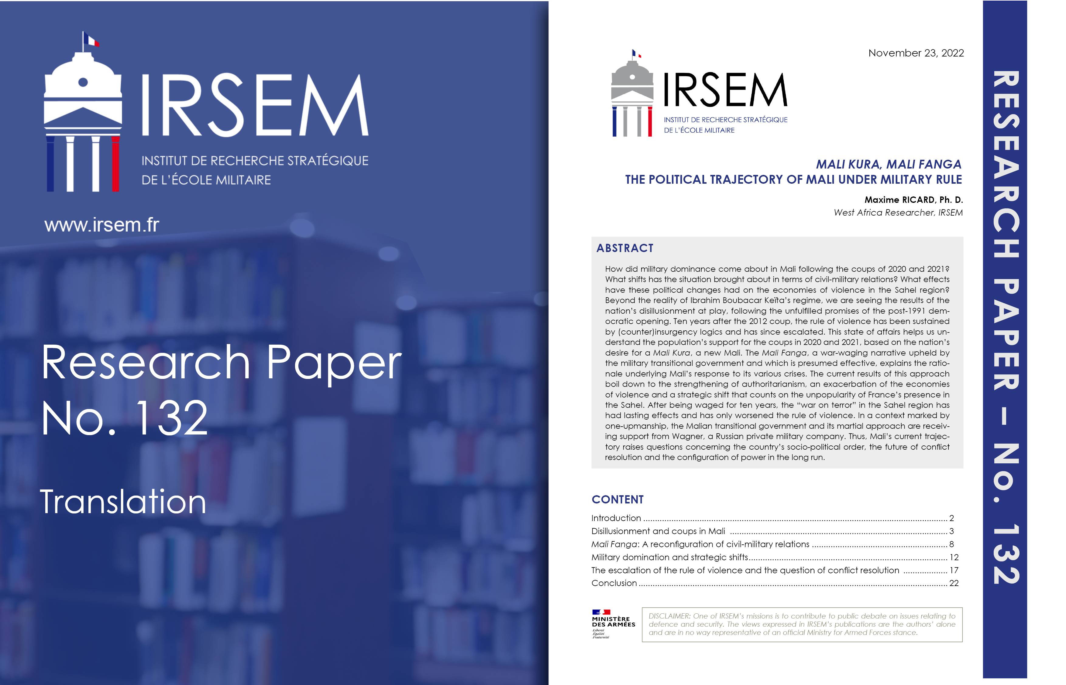 How did military dominance come about in Mali following the coups of 2020 and 2021? What shifts has the situation brought about in terms of civil-military relations? What effects have these political changes had on the economies of violence in the Sahel region? Beyond the reality of Ibrahim Boubacar Keïta’s regime, we are seeing the results of the nation’s disillusionment at play, following the unfulfilled promises of the post-1991 democratic opening. Ten years after the 2012 coup, the rule of violence has been sustained by (counter)insurgency logics and has since escalated. This state of affairs helps us understand the population’s support for the coups in 2020 and 2021, based on the nation’s desire for a Mali Kura, a new Mali. The Mali Fanga, a war-waging narrative upheld by the military transitional government and which is presumed effective, explains the rationale underlying Mali’s response to its various crises. The current results of this approach boil down to the strengthening of authoritarianism, an exacerbation of the economies of violence and a strategic shift that counts on the unpopularity of France’s presence in the Sahel. After being waged for ten years, the “war on terror” in the Sahel region has had lasting effects and has only worsened the rule of violence. In a context marked by one-upmanship, the Malian transitional government and its martial approach are receiving support from Wagner, a Russian private military company. Thus, Mali’s current trajectory raises questions concerning the country’s socio-political order, the future of conflict resolution and the configuration of power in the long run.