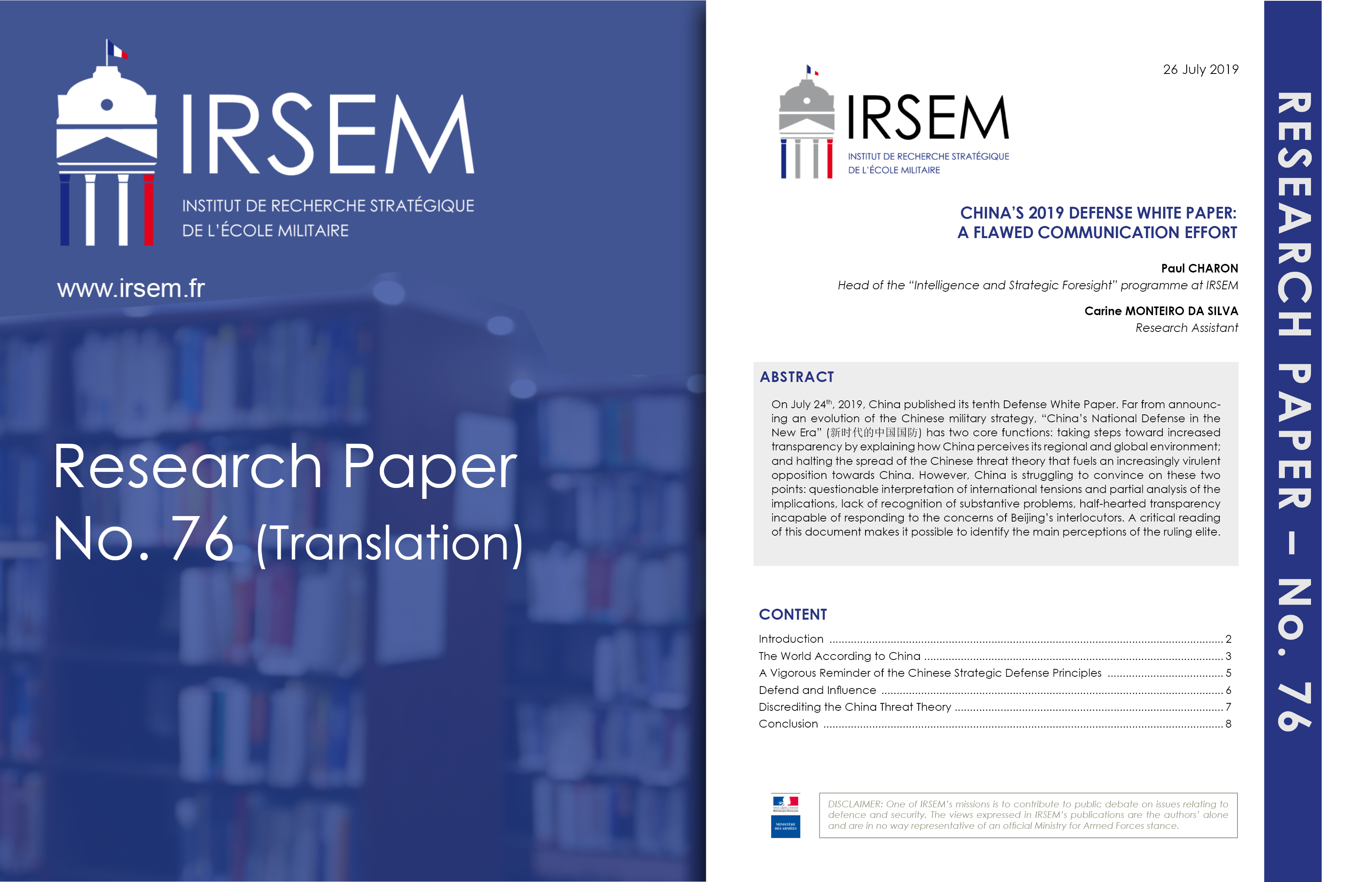 On July 24th , 2019, China published its tenth Defense White Paper. Far from announcing an evolution of the Chinese military strategy, “China’s National Defense in the New Era” (新时代的中国国防) has two core functions: taking steps toward increased transparency by explaining how China perceives its regional and global environment; and halting the spread of the Chinese threat theory that fuels an increasingly virulent opposition towards China. However, China is struggling to convince on these two points: questionable interpretation of international tensions and partial analysis of the implications, lack of recognition of substantive problems, half-hearted transparency incapable of responding to the concerns of Beijing’s interlocutors. A critical reading of this document makes it possible to identify the main perceptions of the ruling elite.