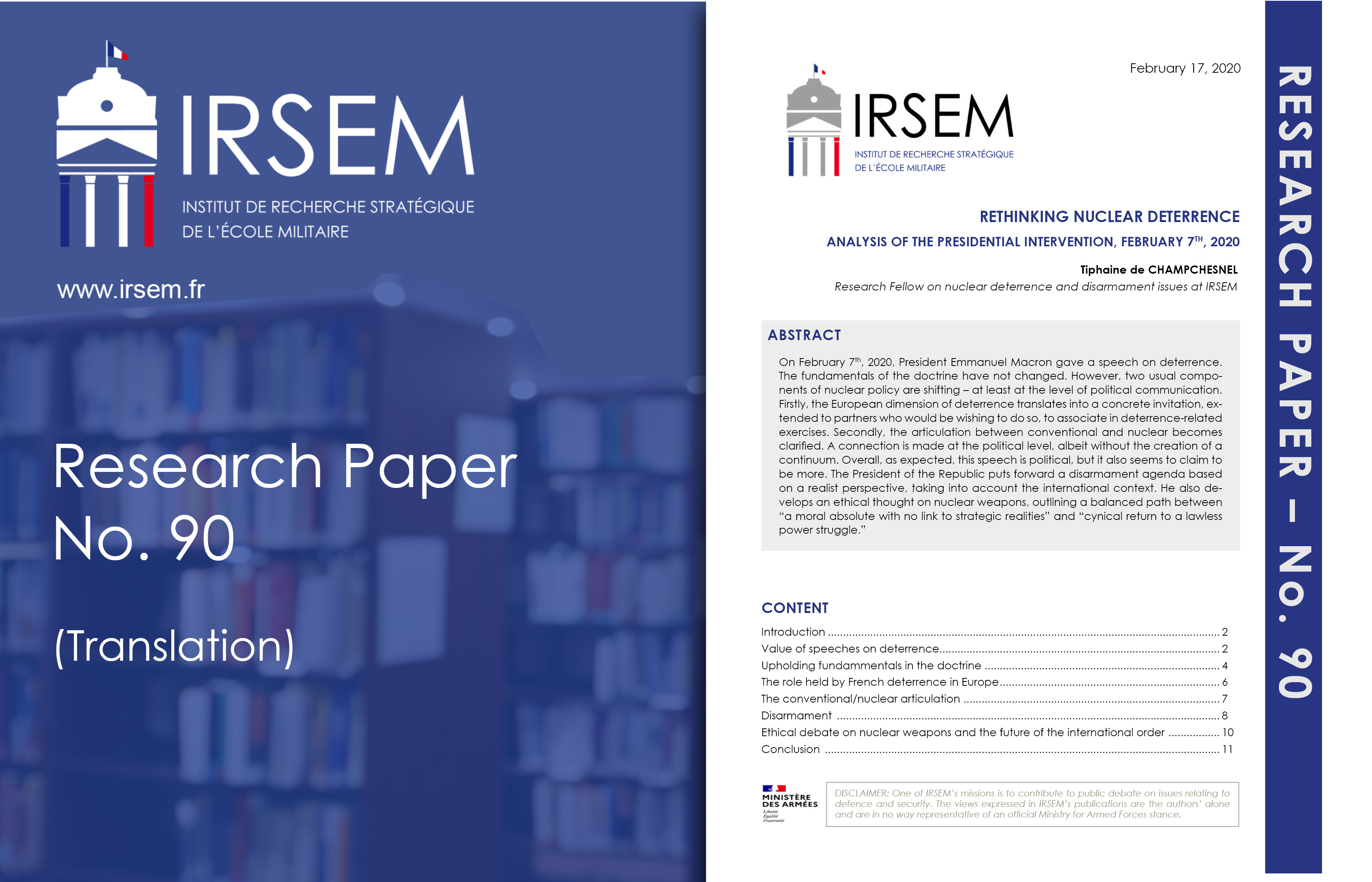On February 7th, 2020, President Emmanuel Macron gave a speech on deterrence. The fundamentals of the doctrine have not changed. However, two usual components of nuclear policy are shifting – at least at the level of political communication. Firstly, the European dimension of deterrence translates into a concrete invitation, extended to partners who would be wishing to do so, to associate in deterrence-related exercises. Secondly, the articulation between conventional and nuclear becomes clarified. A connection is made at the political level, albeit without the creation of a continuum. Overall, as expected, this speech is political, but it also seems to claim to be more. The President of the Republic puts forward a disarmament agenda based on a realist perspective, taking into account the international context. He also develops an ethical thought on nuclear weapons, outlining a balanced path between “a moral absolute with no link to strategic realities” and “cynical return to a lawless power struggle.”
